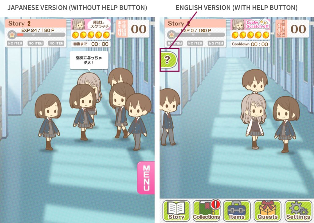 At first glance, it’s possible to see obvious differences on the interface composition as: the position of the menu and the apparition of a “Help” button in the English version which isn’t in the Japanese one.