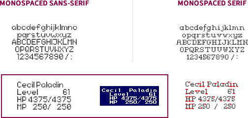 This palette is employed in the HP, MP y CT bars, where there are gradient from blue, red and green to white. The black is for the general text and the white, with the black border, is for the status and some titles.