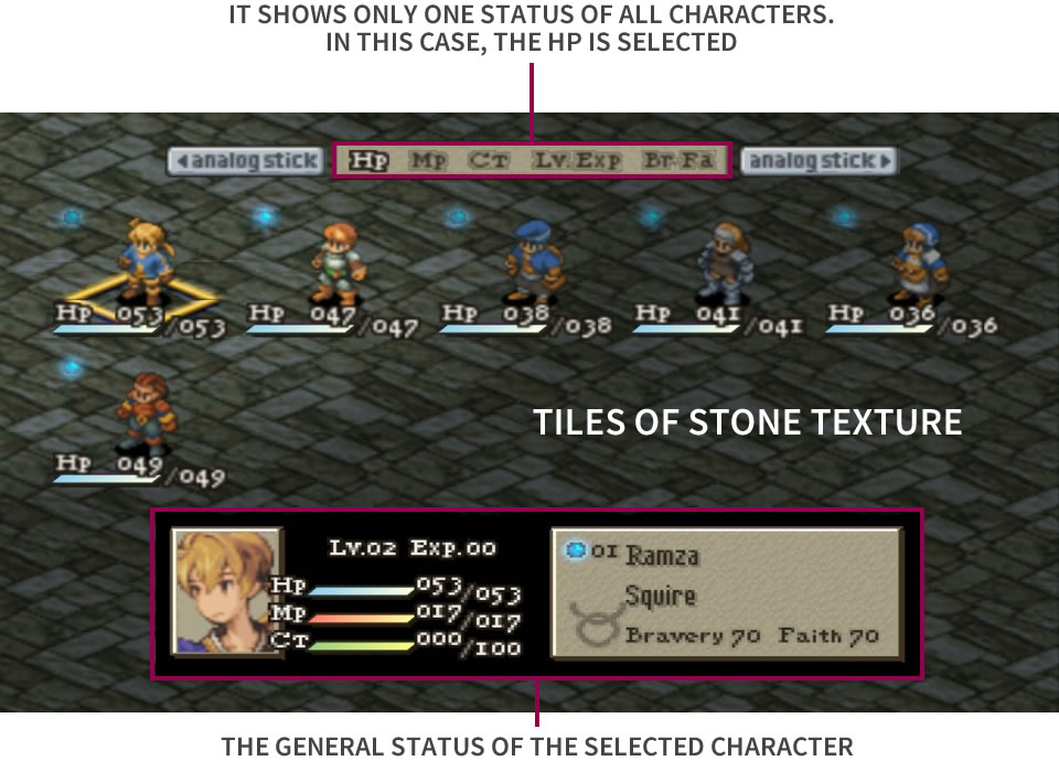 Talking about Final Fantasy Tactics is bringing up a lot of topics as: a story full of intrigues and twist, a profound character customization, the incorporation of new jobs in the JRPG world, a grid-based movements in battle and so on. However, for this post Iโm going to focus on my main area of interest and talk about the visual interface design, which has interesting details I want to discuss. So, with this established, letโs begin!!!