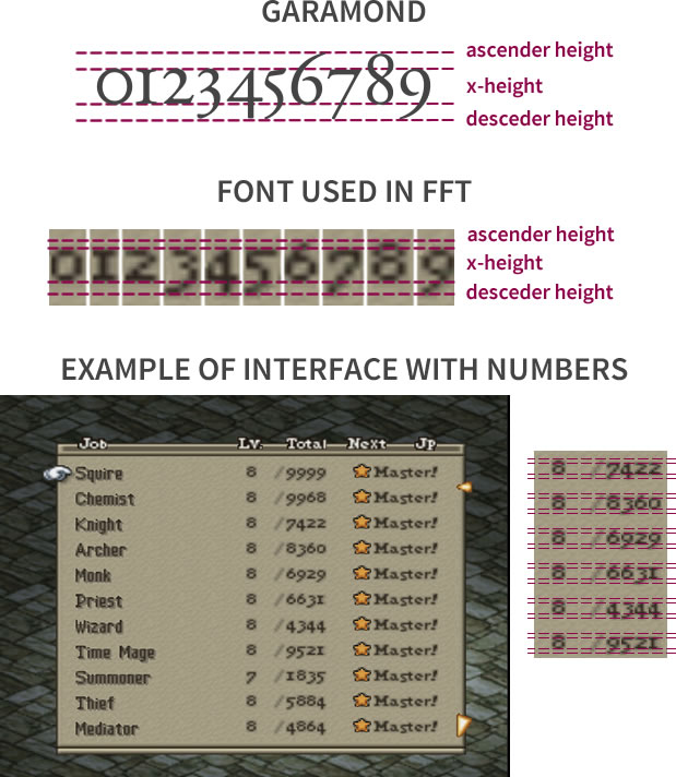 - Another obvious visual detail is the way the numbers have varying heights and alignments. These properties are specific of the oldstyle figures. They are similar to the lowercase characters in that they share the same x-height and have ascenders and descenders. Inside the game, all numbers replicate this rule.