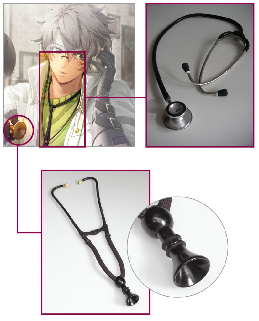 Two items where the steampunk is present it’s in the stethoscope and in the belt buckle. The stethoscope is an obvious steampunk piece due to it combines the 18th and 20th century. The earpieces are like the modern big headphones known in the 20th century, adding the particularity of a transparent case that permits see a series of gears.