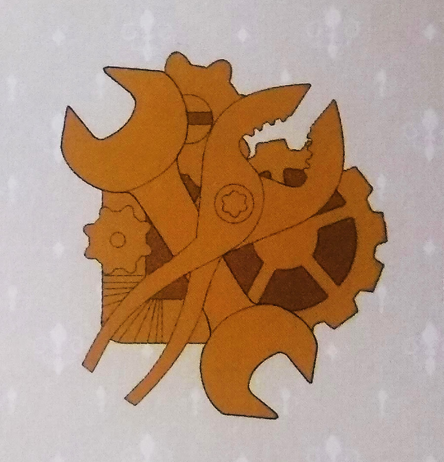 Impey uses his emblem in his belt as decoration. This has the two instruments, mentioned and illustrated before, in a crossed way. Behind them, at the upper and right part, there are gears which are the Steampunk touch of this ornament. Finally, at the right part, the design is completed with a fragment of a steam pipe since the term “Steampunk” came precisely from the idea of a world where the principal technology is steam-powered.