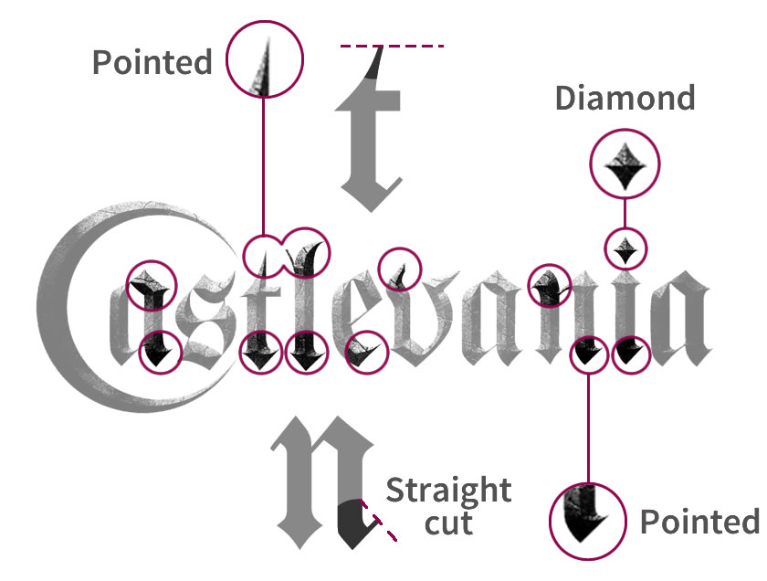 As mentioned above, the choice of this type of font probably resides simply in the fact that Castlevania’s story genre is gothic horror. So, this typeface emphasizes this feature. Nonetheless, there is a detail that can’t go unnoticed, and that is the era. Gothic Sans was born in the 19th century and in the first Castlevania the fight between Simon Belmont and Dracula took place in 1691, so it was necessary to give an “antique” touch to the typography. To accomplish this, the top endings of the characters are tilted at a certain angle to simulate the strokes made by a broad-nib pen. The inclination of the terminal is 30°. The reason for this is the religious connotation, said at the beginning, since “The Vulgate”, a 4th-century Latin translation of the Bible, occupied a Carolingian calligraphy that is achieved by tilting the broad-nib pen 30°.