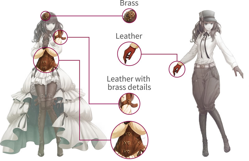 This shape is filled with brown and has yellow details since the color palette applied in the overall Cardia design is mainly formed of these colors. These shades are mostly seen on the items made of leather and brass such as gloves, corset, boots and some decorative straps. Just to remember, this otome is inspired in the Steampunk aesthetic, in which these materials are very common as discussed in the post about Viktor Frankenstein, another important character in this game.