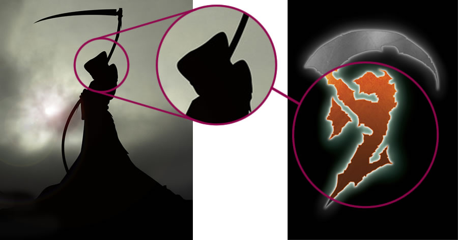However, the scythe is not alone, it is accompanied by another drawing. The latter is probably derived from the robe that hides the skeletal body of Death, and whose concept comes from the clothing worn by religious figures wore when conducting funerary service. This black robe has a hood so, when looking at the top of the “Grim Reaper” when in profile, the silhouette that forms this hood is very similar to the one that accompanies the scythe of the “Soul Eater” True Rune.