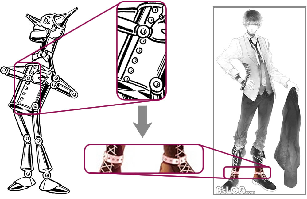 Axel is the OZMAFIA!! version of the Tin Woodman after he obtained a heart. The first element that helps to associate Axel with this character are the two columns of buttons on the vest that are intended to simulate the rivets on the chest with which the Tin Man is always drawn. Circular rivets on the ankle belt of the boots give a similar impression.