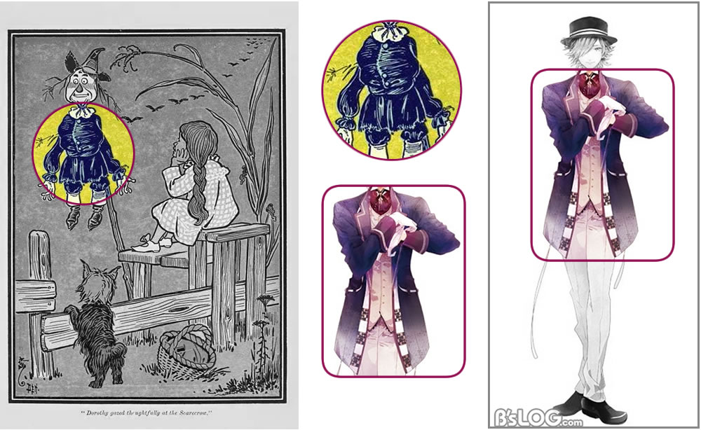 The rest of the Scarecrow figure has a blue suit, however, in OZMAFIA!! the designers preferred to use this tone only in Kyrie’s coat and to employ other colors in the rest of the wardrobe to avoid monochrome and the monotony.