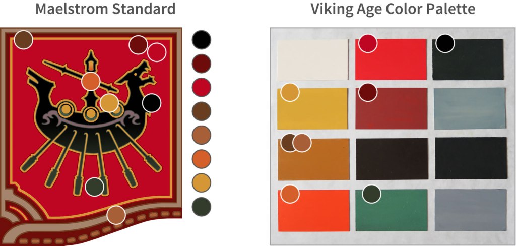 The beige on the border of the flag is a lighter version of ochre (brown), a pigment that was sometimes mixed with milk or white pigments to achieve different color saturations. Finally, purple, used in the decoration found under the shields, was a color that was constantly seen in clothes from the Viking Age, a fact that some archaeologists affirm.