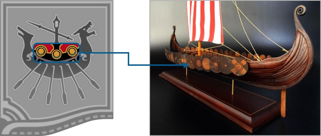 To finish off the subject of shapes, the three circles in the center of the ship appear to be shields due to longships used to be, but not always, equipped with them as in the case of the Gokstad, a 9th century Viking ship.
