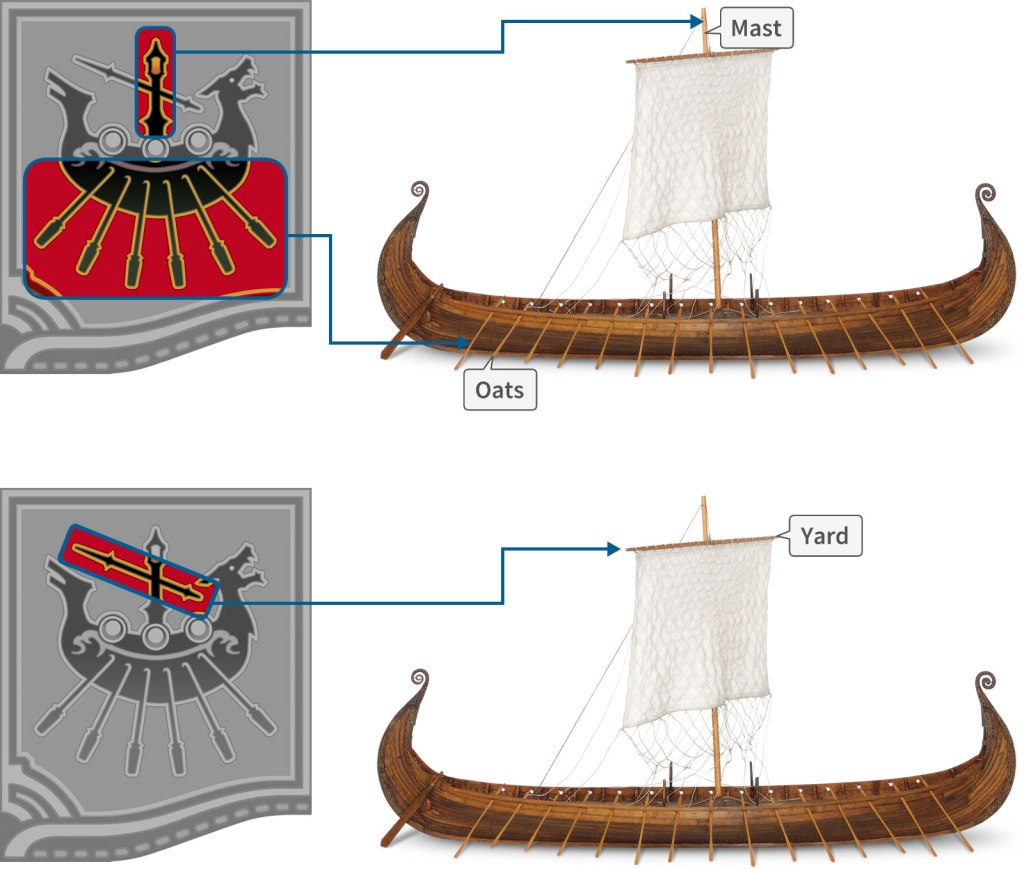 To achieve a simple but understandable symbol for the flag, only the essentials of a vessel are taken. First, the mast and yard without sail are drawn. Then, the oars are placed, but in less quantity since there are 6 instead of 24 or 50.