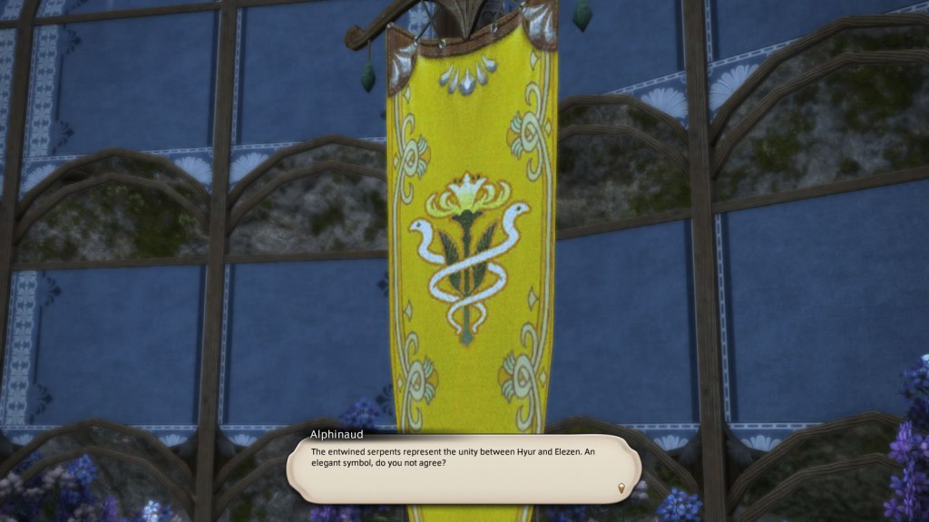 Regarding the images, the central symbol on the standard of the Order of the Twin Adder is the entwined serpents that, according to Alphinaud, represent the unity between the races of Hyur and Elezen.