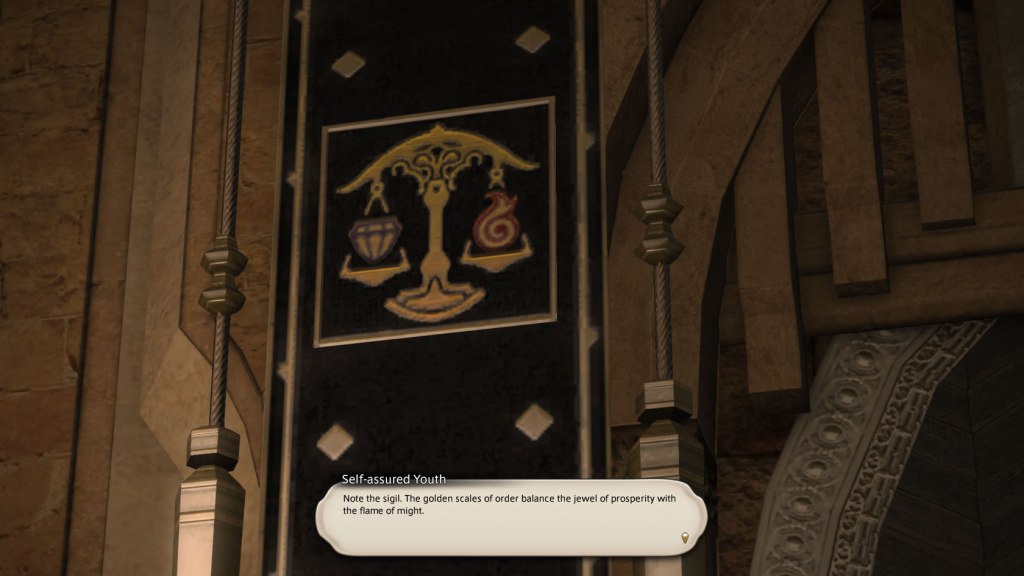 In the above quote, the word “prosperity” seems to refer to an economic situation. This statement comes for two reasons, and the first is its representation through a jewel, an item that one immediately relates to wealth. The second is because the video game emphasizes that the culture and politics of Ul’dah has greatly been dominated by trade and profiteering, which is why it’s considered a city-state with much commercial significance in Eorzea. So, the jewel on the scale is Ul’dah way of communicating the importance of the profits made through trade.