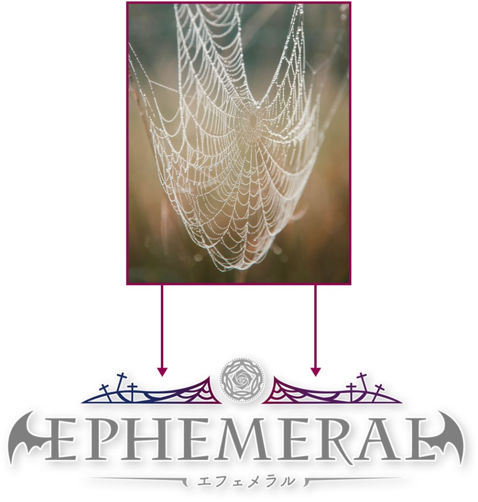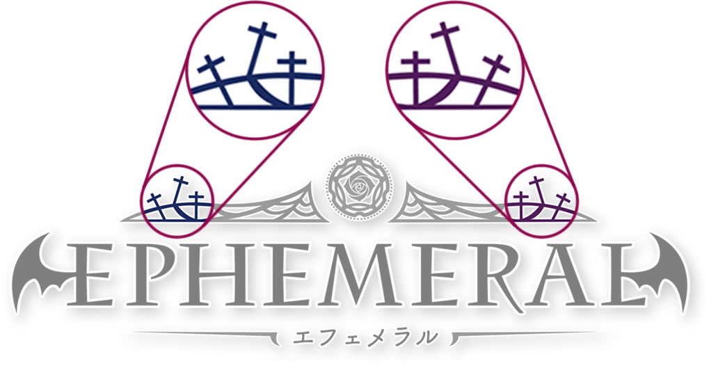 Finally, color is always an important piece to consider. The “Epehemeral” logo applies black and different shades of purple. The first is to emphasize the idea of darkness raised from the explanation of the game and the logo. Because purple is considered rare in nature, giving it a supernatural aura for centuries, it makes it the ideal shade to reflect the characters, events and places of this otome. The purples applied in the radial gradient go from violet predominant blue that is in the spider webs, to a red-purple that allow an almost red in the rose to approach the symbolism of love.