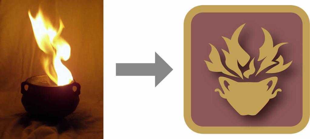 Therefore, a cauldron with flames allows one to immediately think of the raging fire of the rituals and sorcery, actions performed by Thaumaturges.