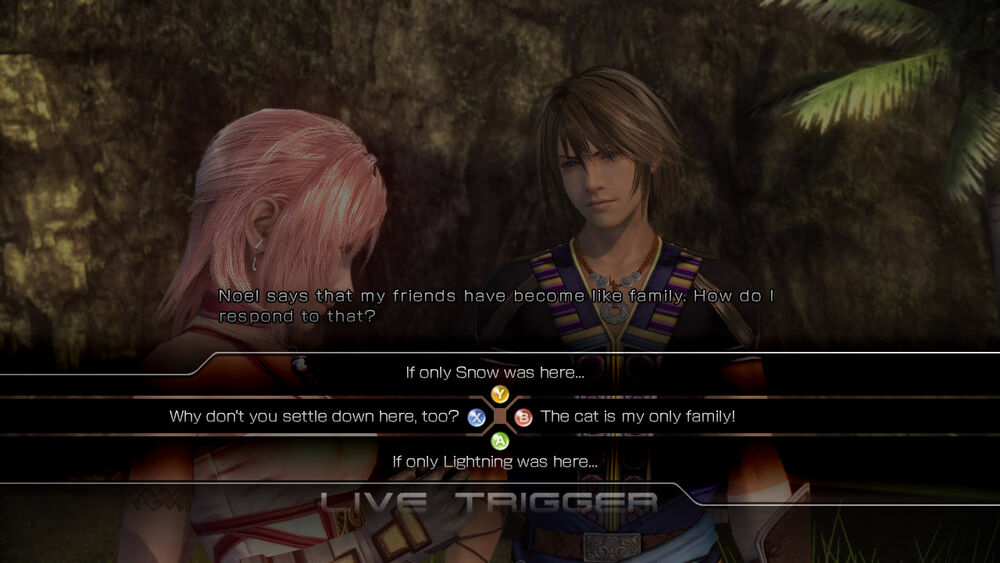 Another way to utilize the radial menu is to choose options, for example in conversations. In this case, it is very common that these are not more than four to allow assigning a response to each of the buttons of the โABXYโ scheme of the control of the consoles. This is because in these circumstances, circular menus are considered faster and more reliable than linear menus due to they reduce playerโs work by avoiding the use of directional buttons by pressing only the button of the desired answer. One game that applies this method is โFinal Fantasy XIII-2 (2011)โ.