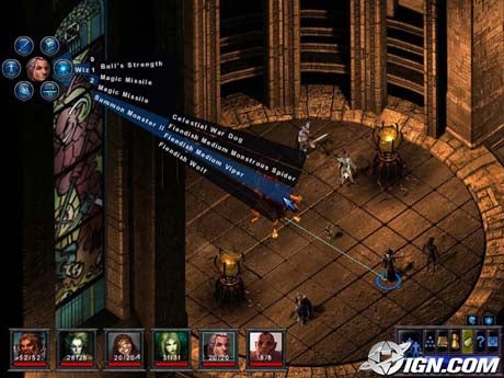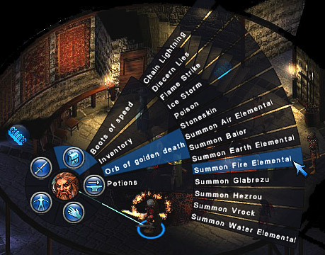 “Temple of the Elemental Evil (2003)” is an RPG in which the creators decided to use the radial menu and tried to solve the aforementioned problem by using concentric circles to keep all hierarchies visible. In this game, the central menu item is the face of the focus character, and the first level employs the icons of the six main actions. When the player picks an icon, a fan of options appears. This same fan technique is followed in the case of more hierarchies. However, this method is not practical when there are more than three levels, as it takes up too much space on the screen, forcing the player to scroll or reposition the menu to see it in full.